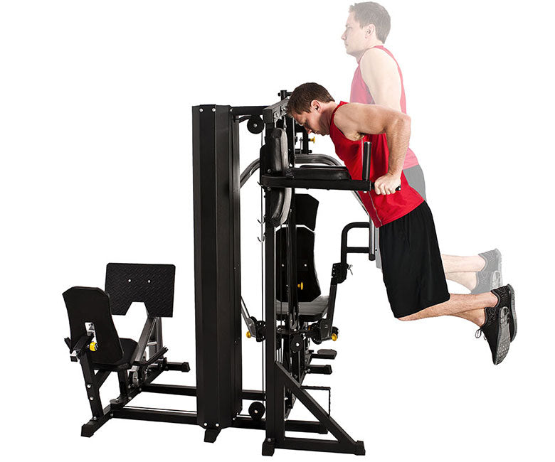 Leg press and Vertical Knee Raise stations offer additional lower-body and core workout options